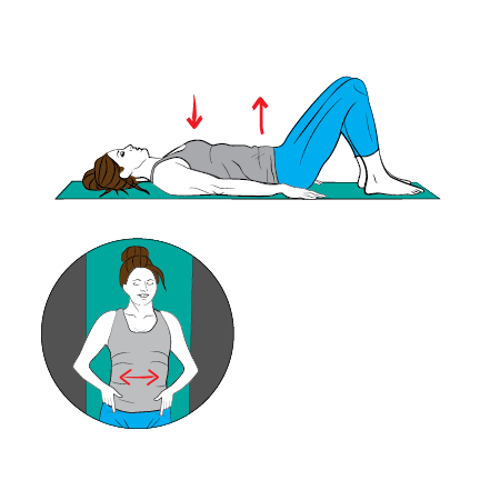 Položte se na záda a pokrčte nohy, snažte se stáhnout ramena od uší a rozložit váhu těla na celou plochu zad, od lopatek až po pánev. Hlavu mějte v prodloužení páteře a bradu držte blíž ke krku. Hrudník a žebra povolte dolů, snažte se nádech směřovat do podbřišku, boční a zadní strany žeber a beder. S výdechem se snažte udržet aktivitu břišní stěny, kterou jste s nádechem získali.