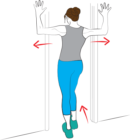 Postavte se mezi rám dveří. Opřete si lokty ve výšce ramen, předloktí a prsty směřují nahoru. Nakročte jednou nohou a přenášejte váhu vpřed. Dávejte si pozor na pozici ramen (nezvedají se nahoru) a neprohýbejte se v bederní páteři.